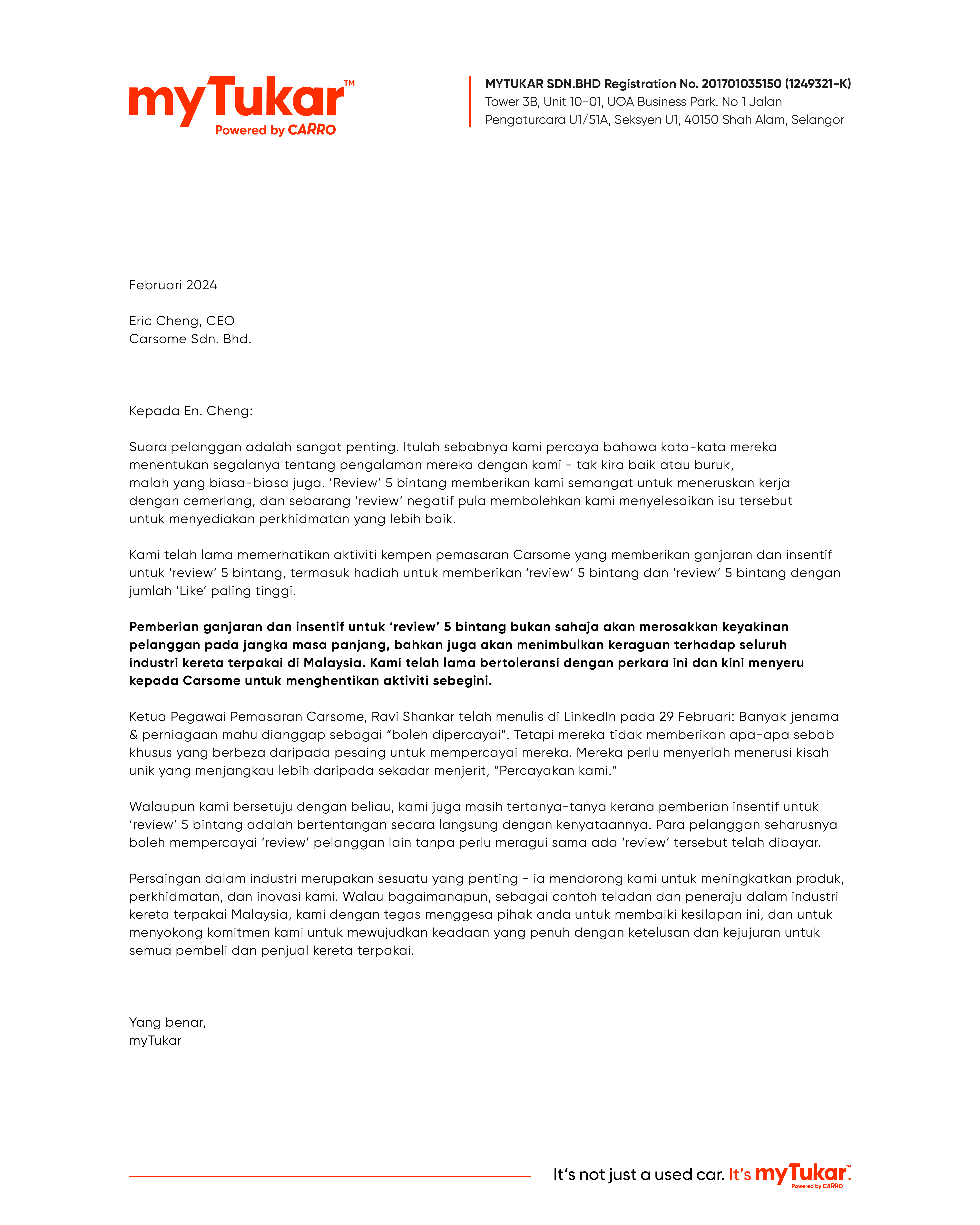 Rewarding and incentivising 5-star reviews will not only erode trust and reliability in the long run, but also create an environment of mistrust across the used car industry in Malaysia. We have long tolerated this and strongly urge Carsome to cease such activities.