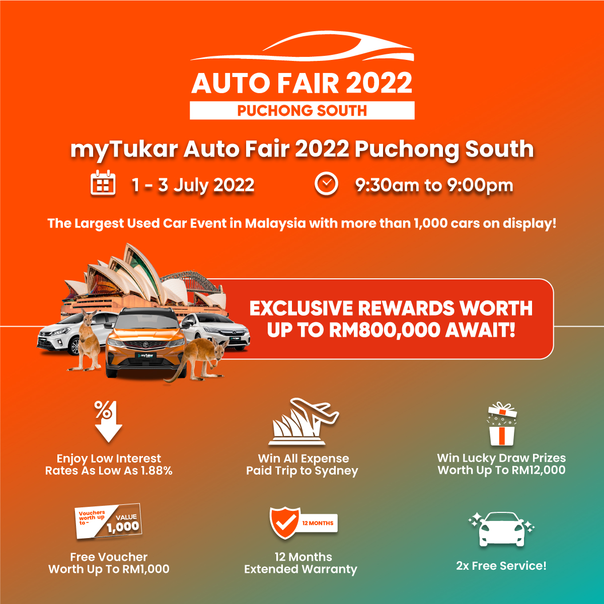 Taking a loan for a car may be difficult. You have to find many different banks to compare interest rates. At myTukar Auto Fair 2022 Next Stop: Puchong South, our panel of partner banks will be there so you don’t have to go around town just to know what rates you can get! Not only that, interest rates are as low as 1.88%!