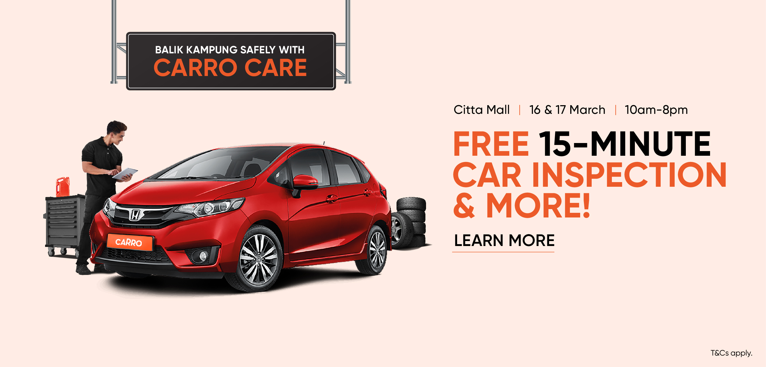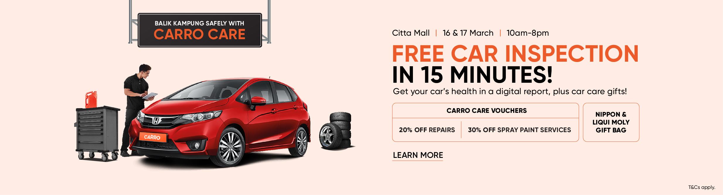 Head over to Citta Mall’s parking lot on the 16th and 17th of March to get 30% off on spray paint services, 20% off on car repair services and exclusive goodies from Carro Care, Nippon Paint and Liqui Moly! All you need to do is get a short 15-minute, FREE car inspection and valuation!